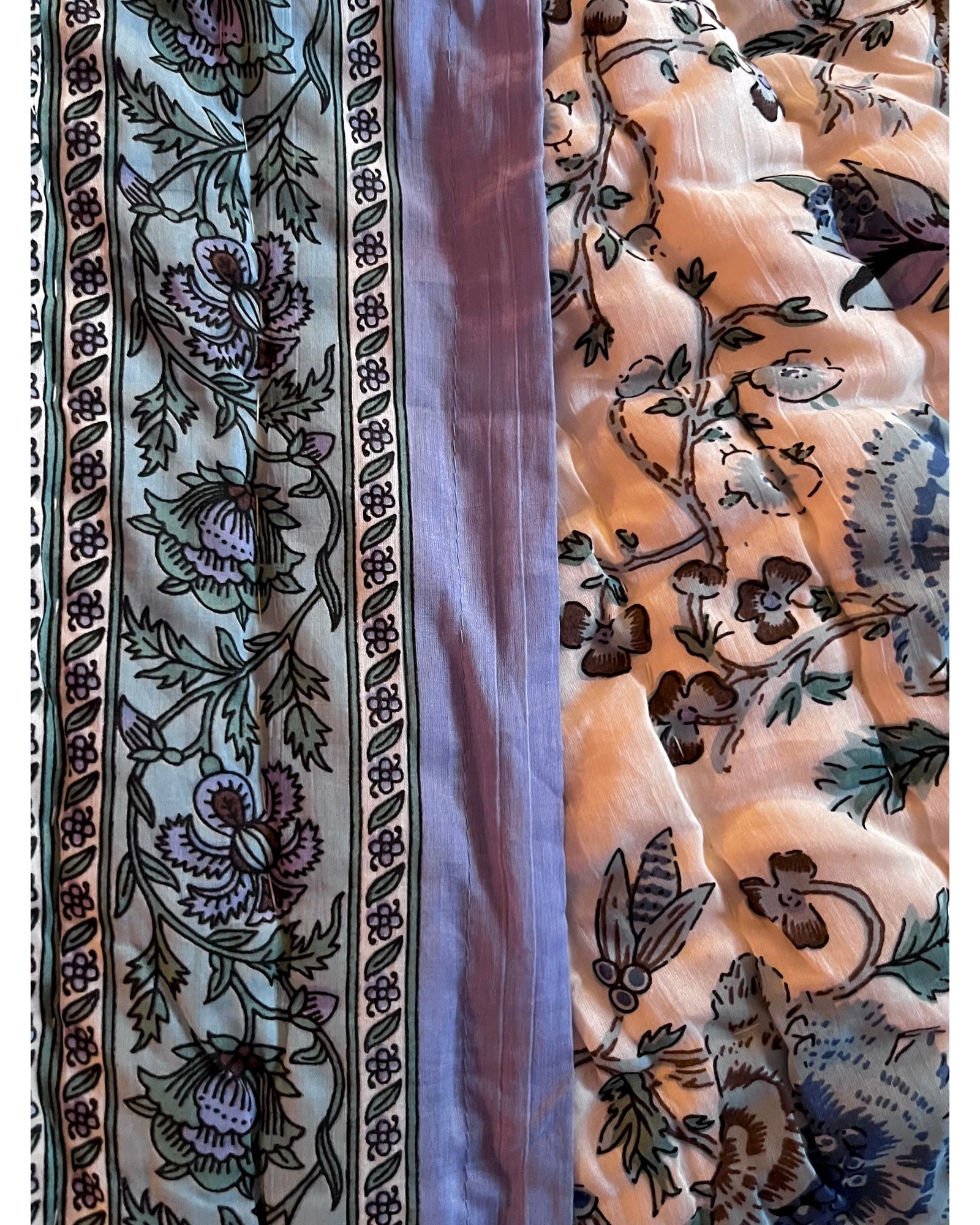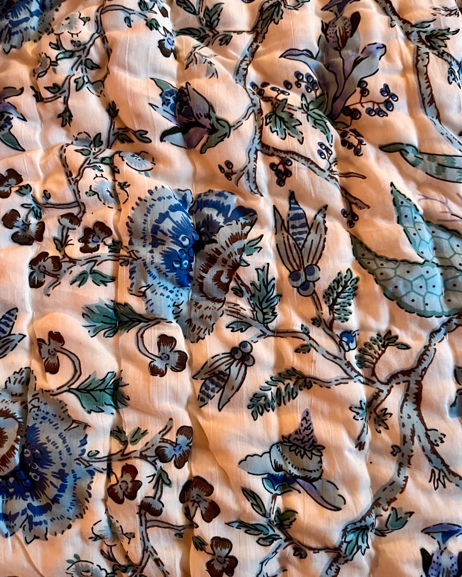 A Beautiful hand-block printed Super King sized quilt. The delicate floral and berry print, in a combination of stunning blues will transform a room.