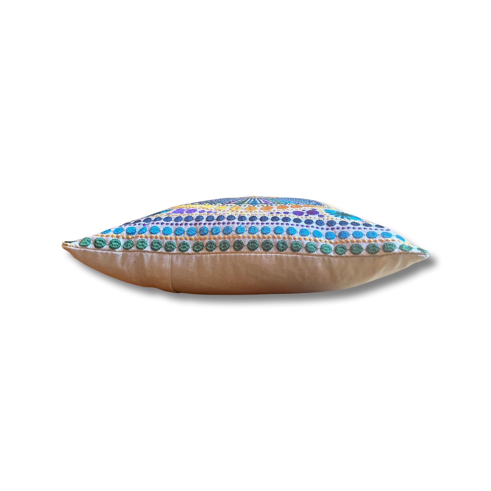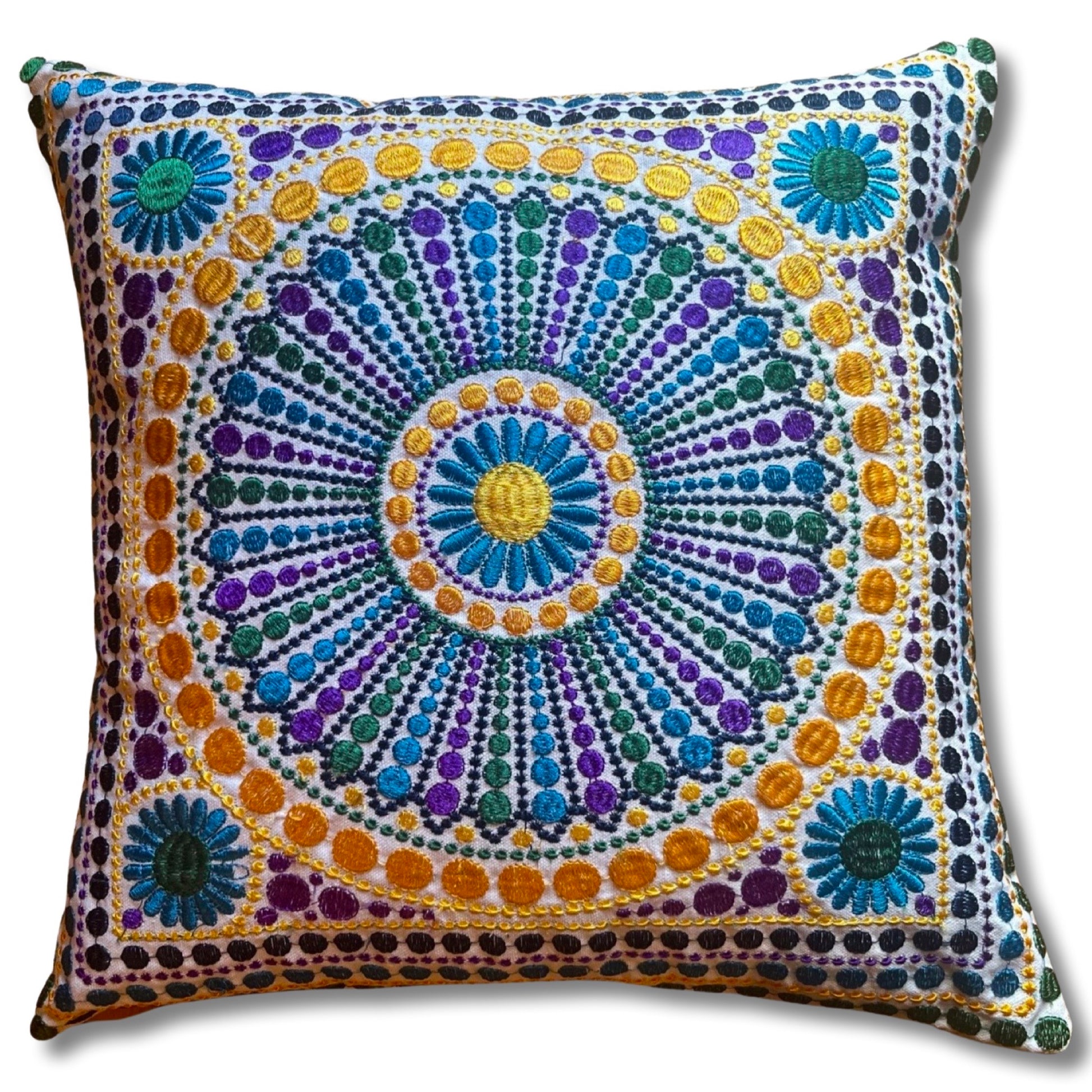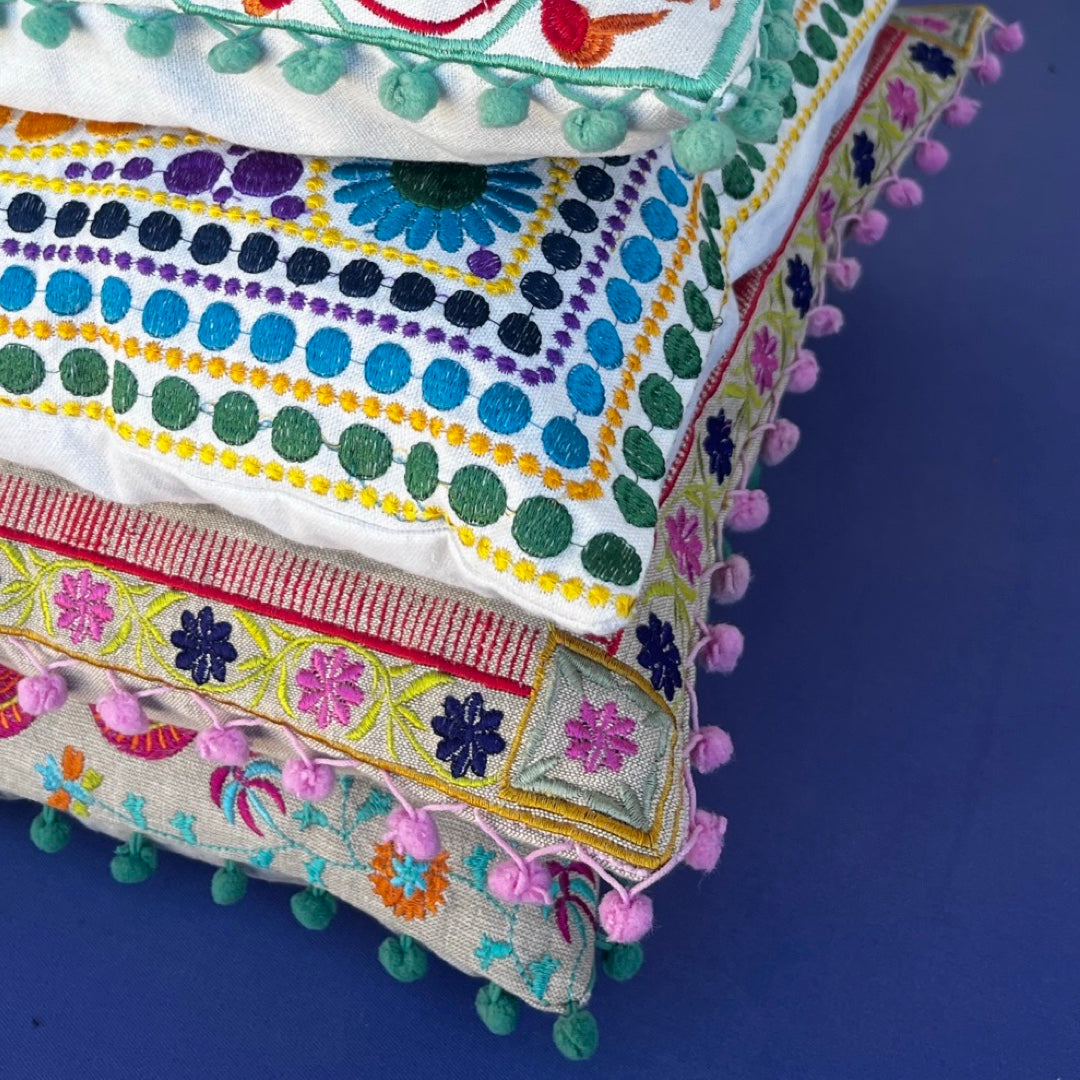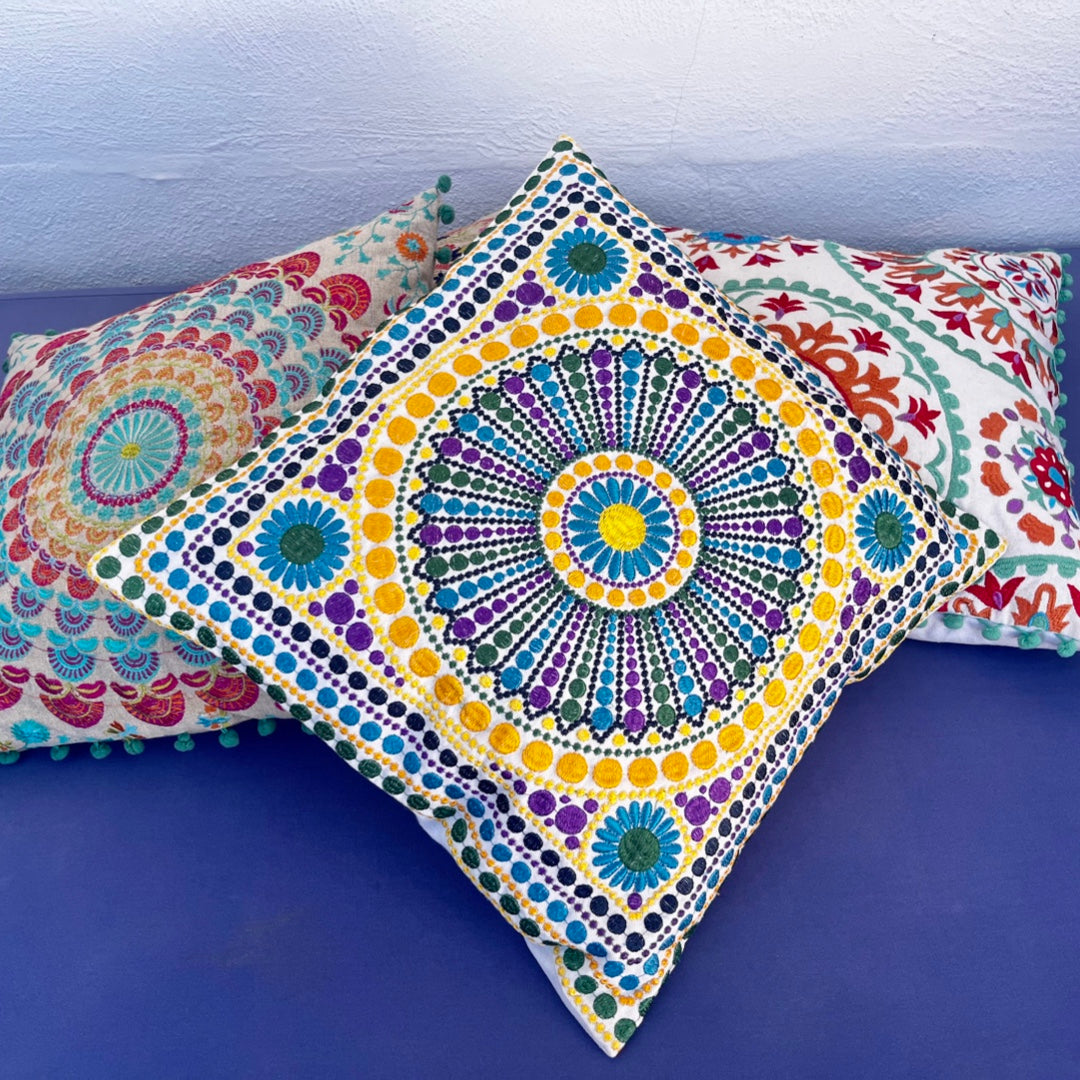Beautifully embroidered Suzani cushion covers with bold, colourful patterns. Each one showcases traditional Central Asian designs, made by artisans in Jaipur. Measuring 16 x 16 inches.