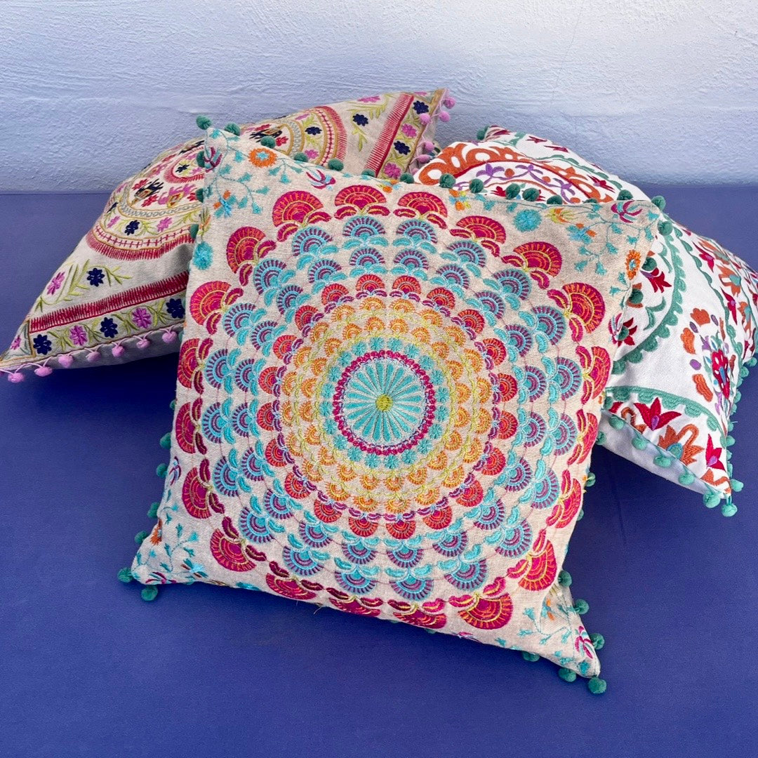 Beautifully embroidered Suzani cushion covers with bold, colourful patterns. Each one showcases traditional Central Asian designs, made by artisans in Jaipur.