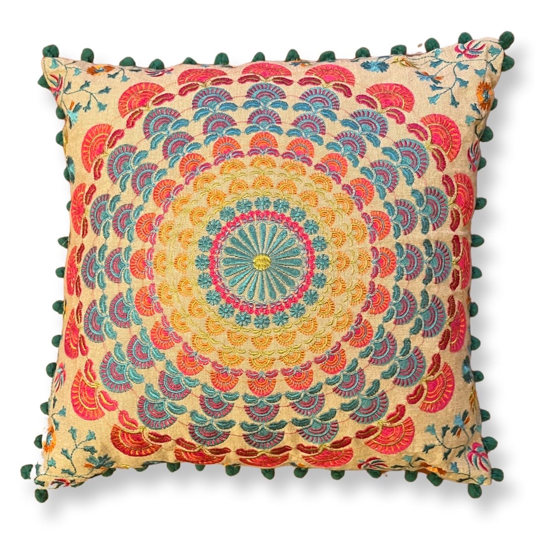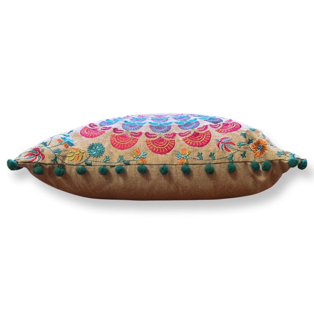 Embroidered Suzani Pom Pom Cushion Cover - Turquoise fans