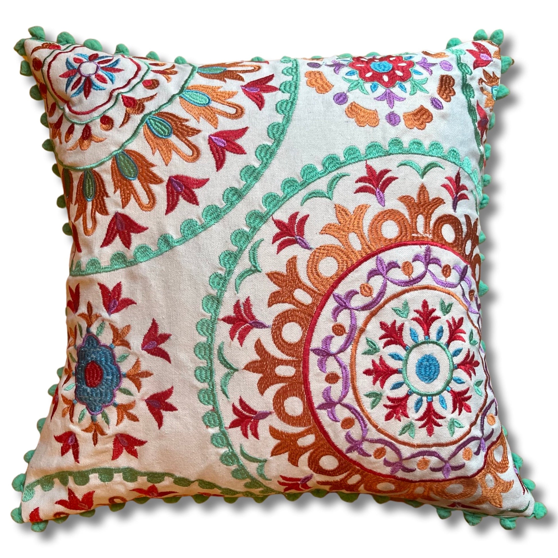 Embroidered Suzani Pom Pom Cushion Cover - Tulips
