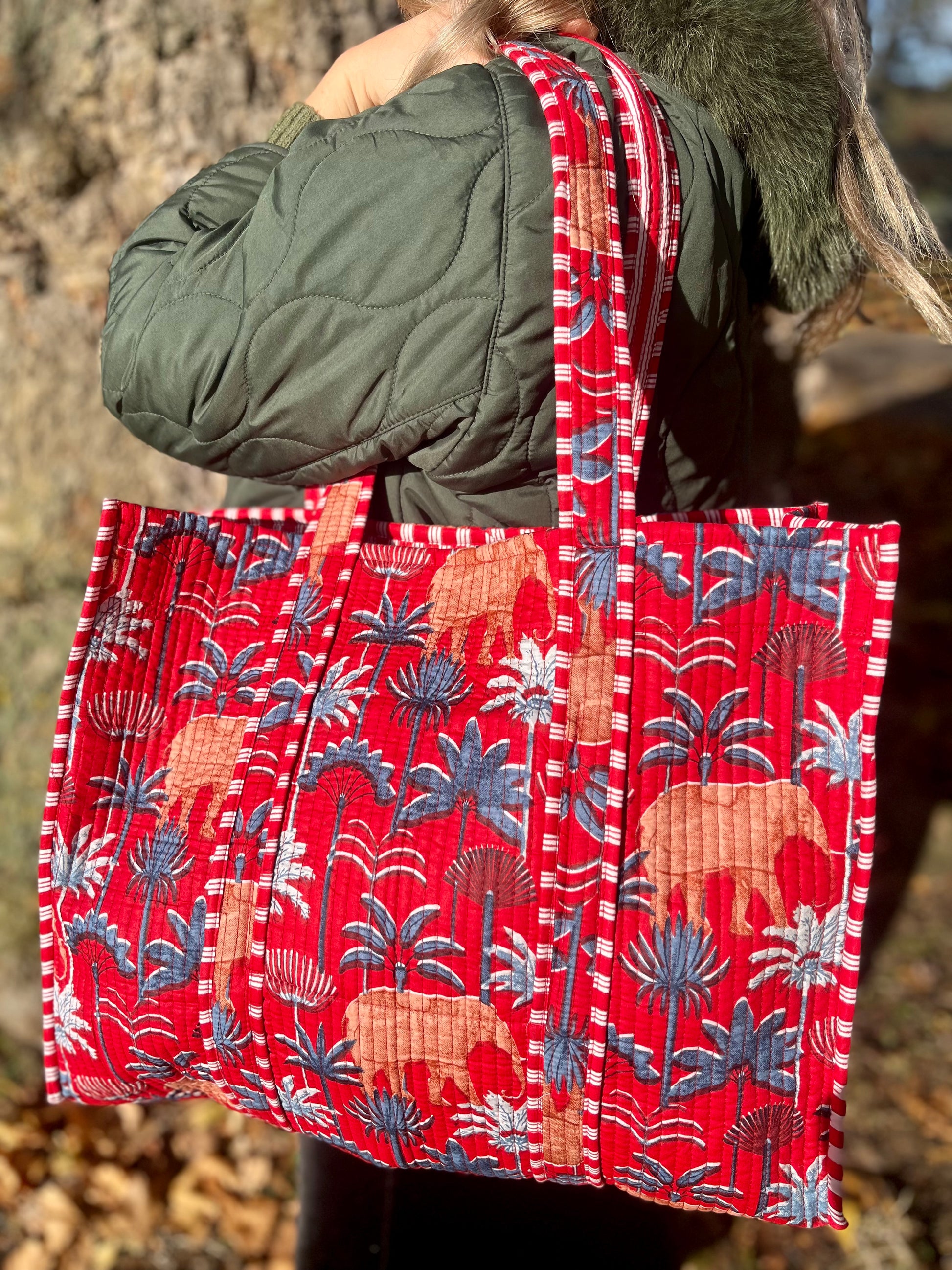 Our generously sized tote bags are perfect for weekend getaways or everyday use, featuring a coordinating inner lining that complements the strap detail.