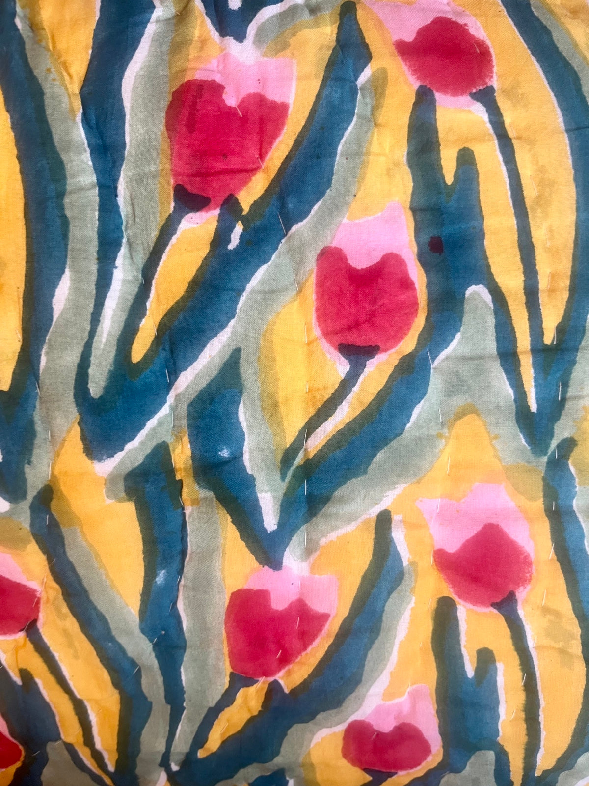 A Beautiful hand-block printed Super King sized quilt. The fun, bold tulip print, in a combination of stunning pinks, reds and yellows will transform a room.