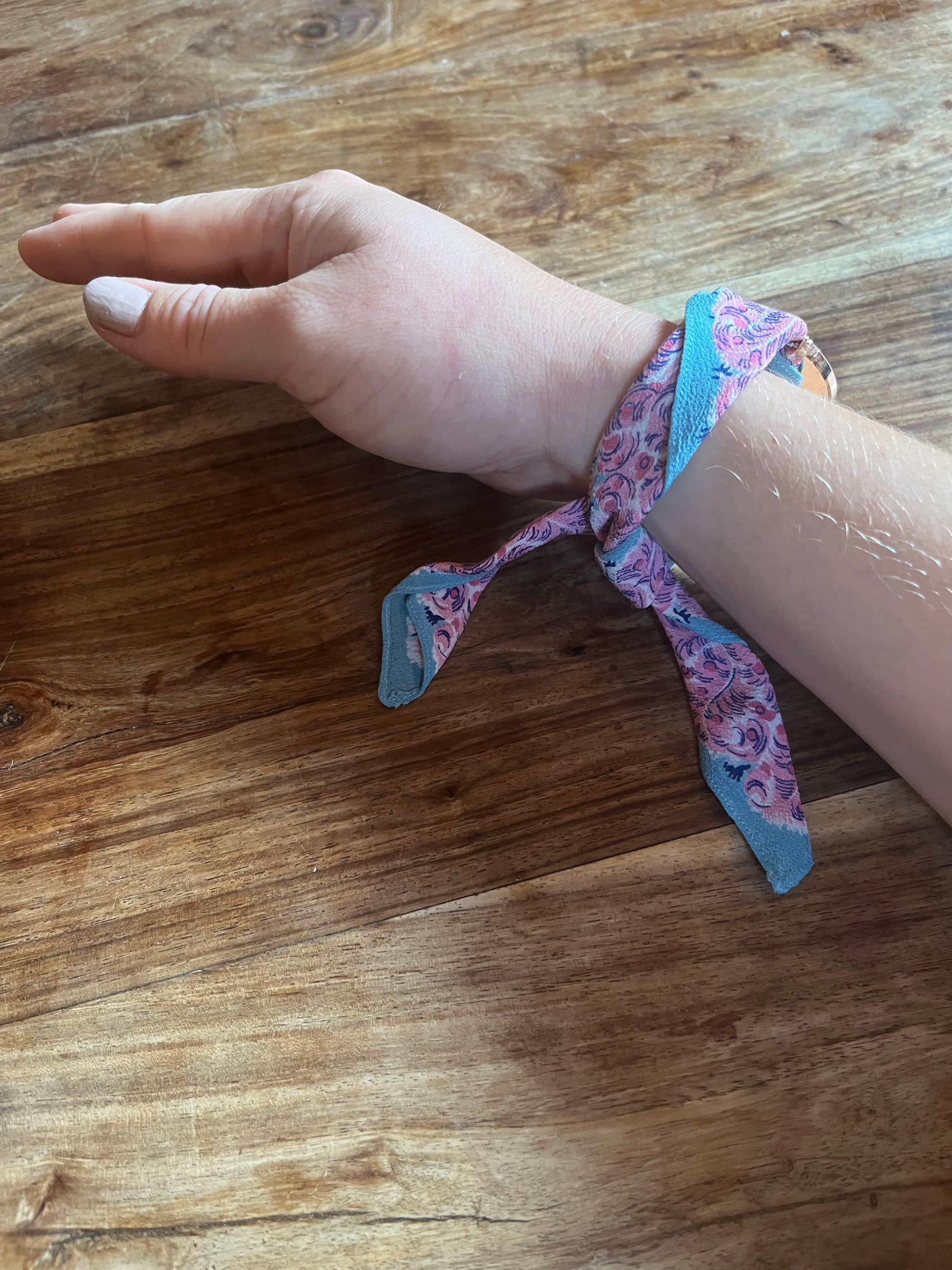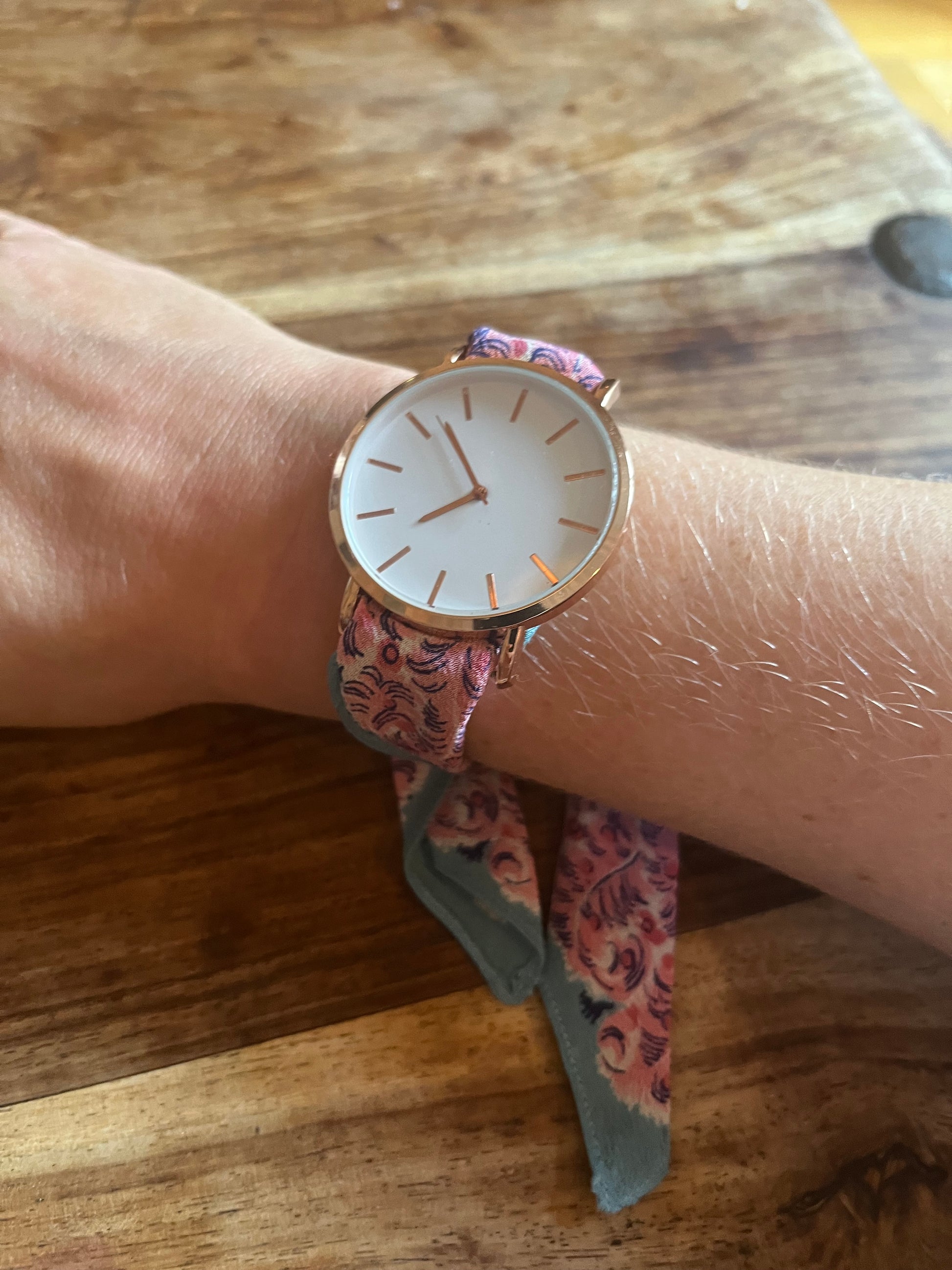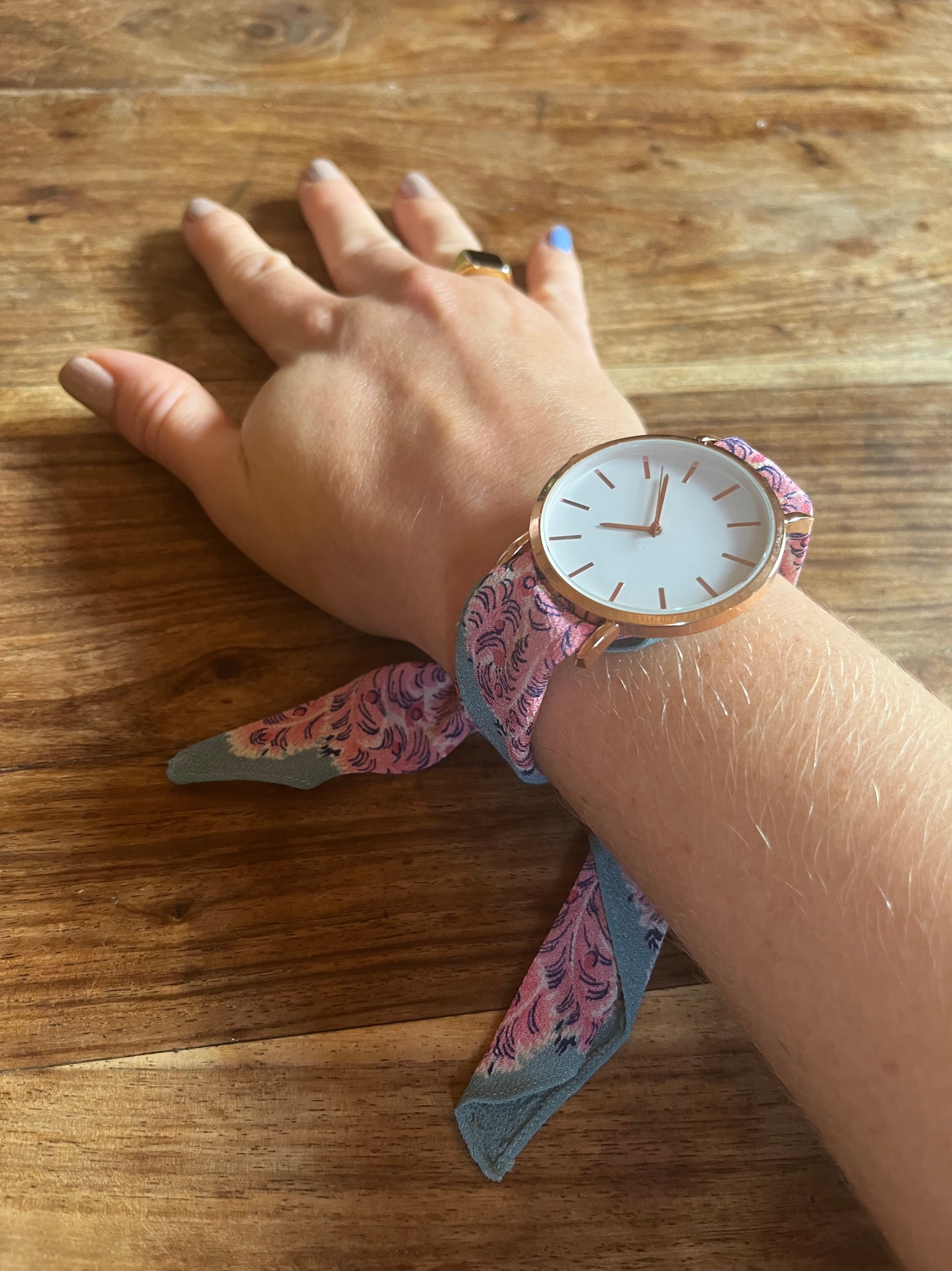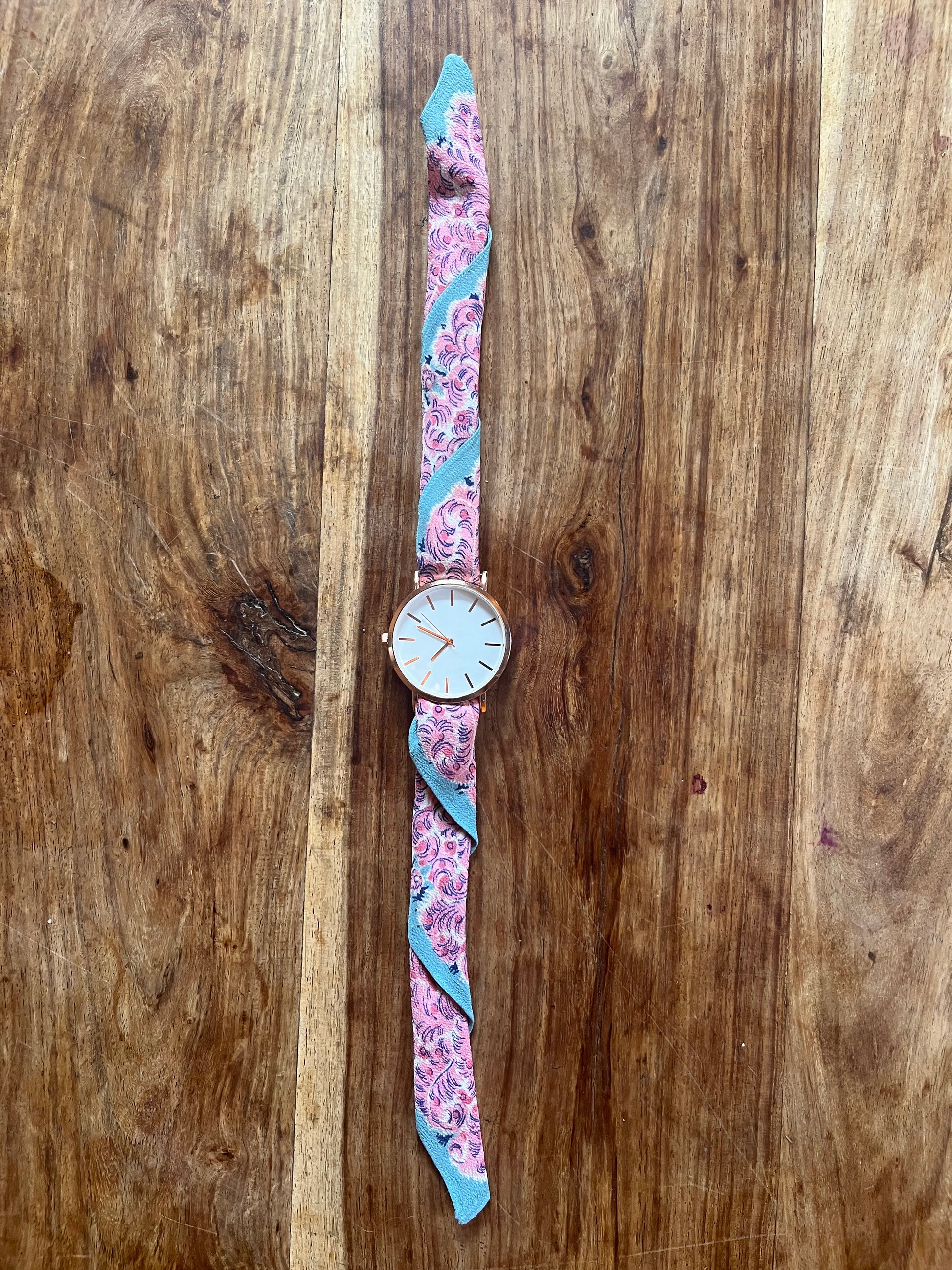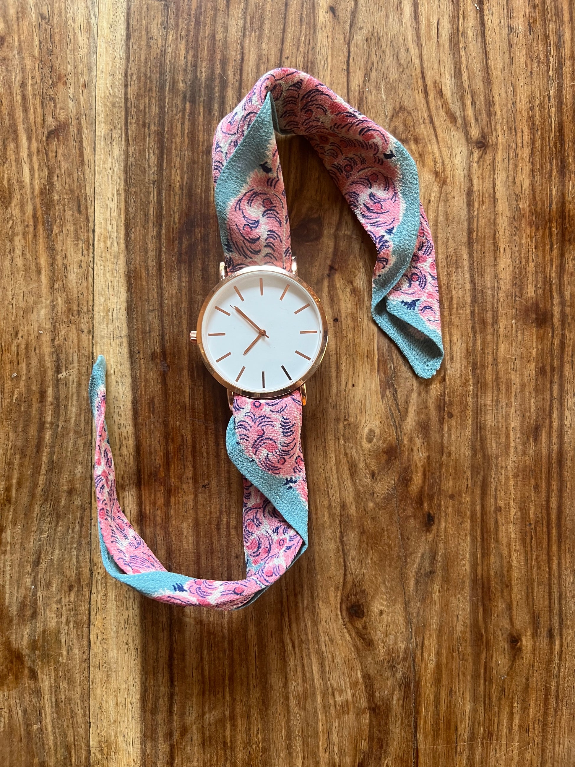 The watches are made with unique vintage silk handkerchiefs, collected from sellers all around the world. Each watch is different and some vary in size, but all are large enough to double tie in a knot.