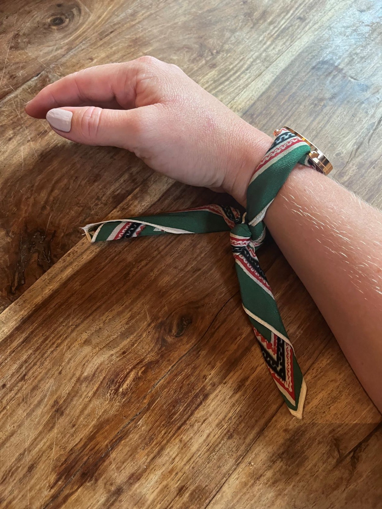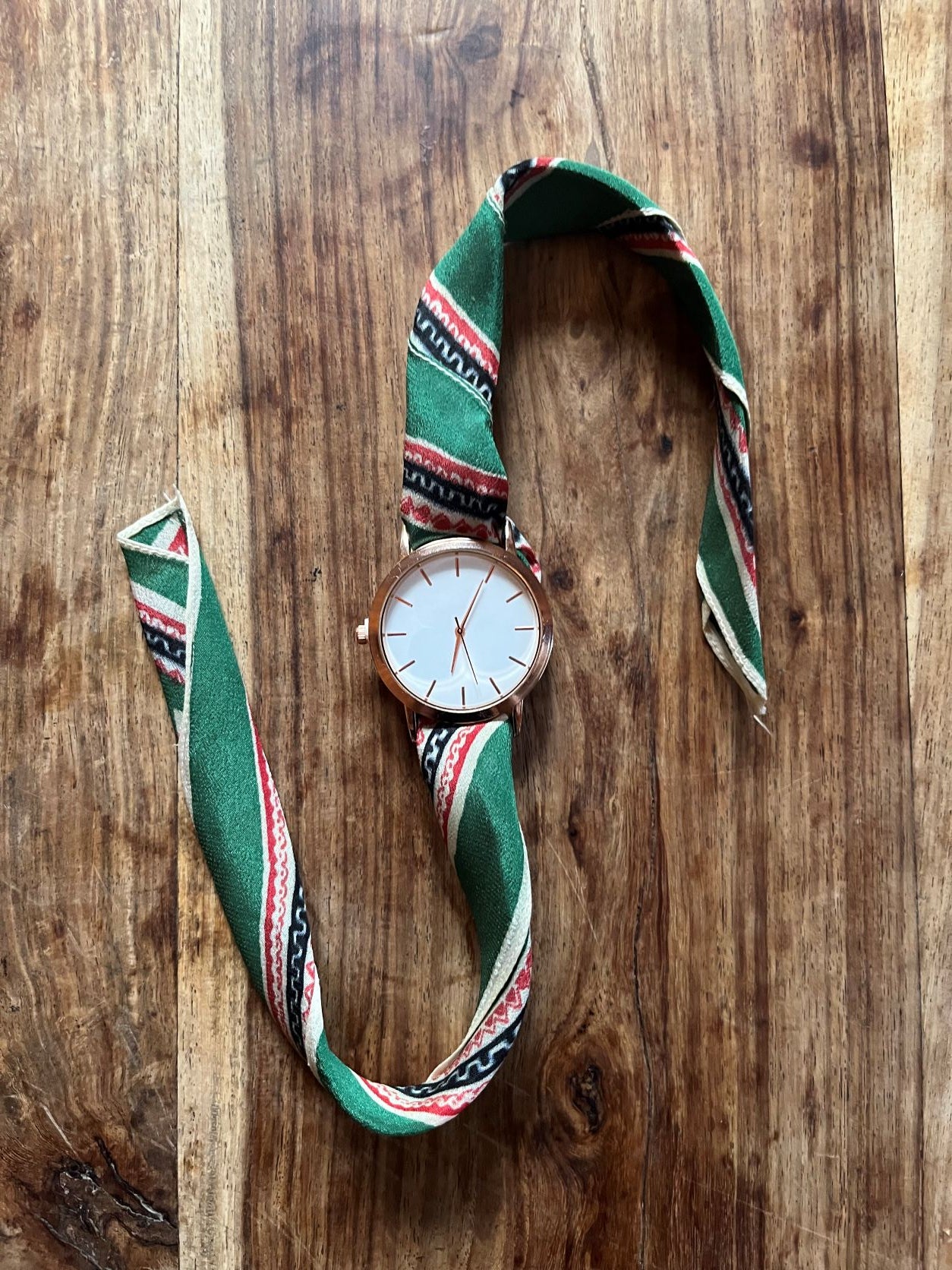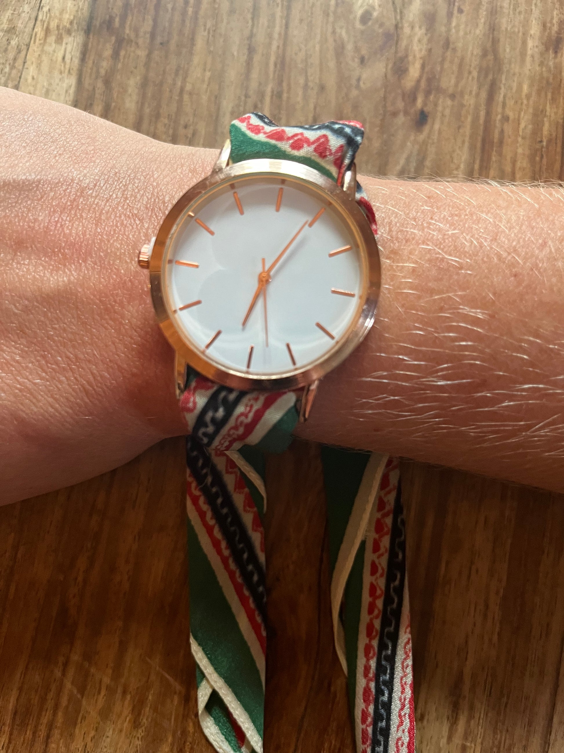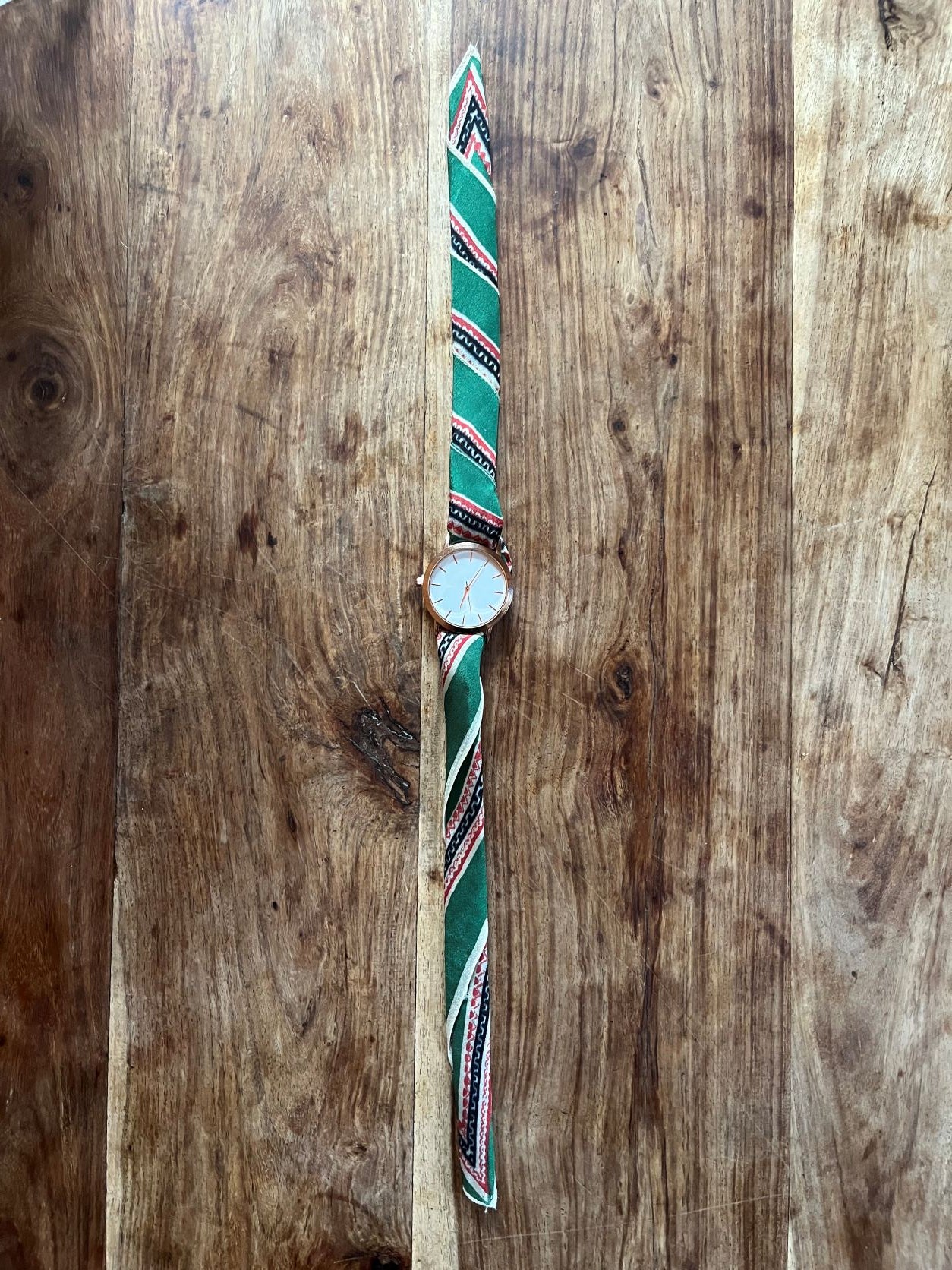 The watches are made with unique vintage silk handkerchiefs, collected from sellers all around the world. Each watch is different and some vary in size, but all are large enough to double tie in a knot.